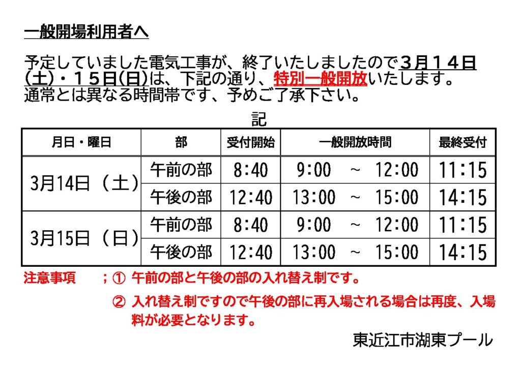一般開場ご利用の皆様へ
